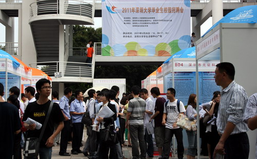 5月26日,2011届深圳院校毕业生校园招聘会在我校学生活动中心广场举行。这次招聘会由深圳市人力资源和社会保障局主办,深圳市劳动就业服务中心、vsport招生就业办公室承办,深圳市人才交流服务中心有限公司等承办,以“放飞青春梦,传递就业关怀”为口号,共有90余家用人单位参加,提供需求岗位约2000个。 招聘会现场反响热烈,不少同学在烈日下排起了长队。深圳福田银座村镇银行、深圳市绿色天使文化艺...