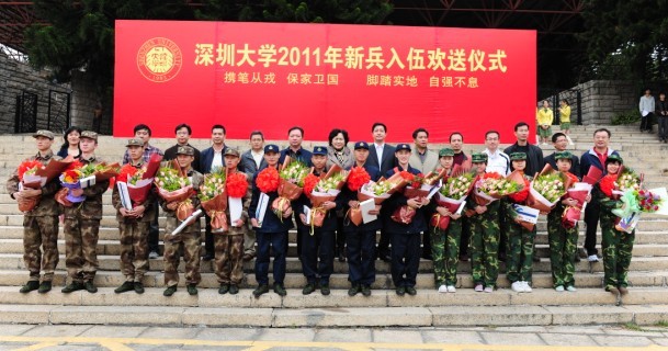 “携笔从戎,保家卫国,脚踏实地,自强不息”。12月9日上午,我校2011年入伍学生欢送仪式在演会中心前举行。校党委副书记陶一桃、副校长李永华以及武装部、各学院领导、新兵家长代表及学院师生代表出席欢送仪式。 我校征兵工作有着优良传统,前不久我校分别被评为南山区和深圳市2010年冬季征兵工作先进单位。今年我校冬季征兵从10月20日开始启动,得到了全校师生的广泛关注和大力支持。同学们积极响应祖国号召,...
