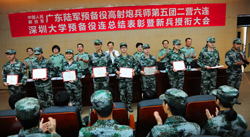 9月29日下午,我校预备役连总结表彰暨新兵授衔大会在图书馆南馆报告厅召开。预备役五团团长柳奎德、副团长黄漫娥,二营营长唐昊、教导员罗平;我校副校长李凤亮及武装部、学生部、团委的相关负责人与全体新兵参加了会议。 在嘹亮的《中国人民解放军军歌》中,武装部部长谢海均宣读表彰通报,表彰获得“2013年度优秀预编士兵”称号的31名同学。 唐昊宣读入队命令:“根据中国人民解放军...