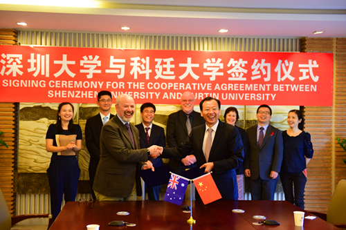 6月3日下午,我校与澳大利亚科廷大学在办公楼301举行合作签约仪式。科廷大学副校长Seth Kunin、Steve Mickler,媒介、文化与创意艺术学院院长Michele Willson,我校副校长李凤亮,国际交流与合作部、研究生院、文化产业研究院等部门相关负责人参加仪式。 李凤亮对科廷大学副校长一行的到来表示欢迎。他介绍说,文化创意产业在深圳市蓬勃发展,在过去的一年,文化创意产业的经济规模占到了全市全年GDP总量的百分之十。目前深圳大...