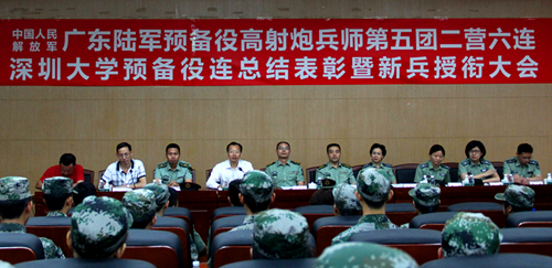 6月13日,我校预备役连总结表彰暨新兵授衔大会在图书馆南馆报告厅举行。预备役五团政委金立新、预备役五团团长柳奎德、福田区人民政府副区长(预备役五团预任副团长)黄漫娥、预备役五团二营营长徐亚琼、福田区妇联主席(预备役五团二营预任教导员)罗平,我校副校长李凤亮,党政办、学生部、武装部、校团委等相关部门负责人及六连全体官兵出席了大会。 大会以一首嘹亮的《中国人民解放军军歌》拉开帷幕。徐亚琼宣读入队命令,...