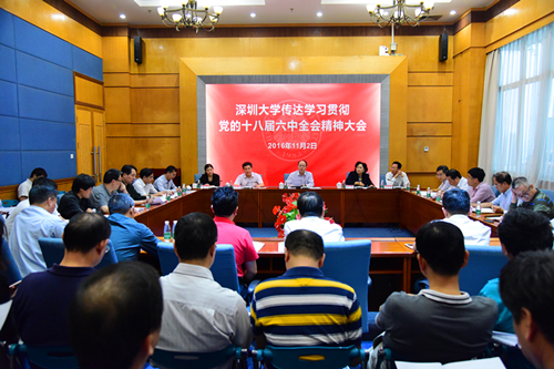 11月2日下午,我校在国际会议厅D厅召开大会,传达学习贯彻党的十八届六中全会精神。全体在家校领导,各学院院长或主持工作副院长、各基层党委(总支)书记、机关各部室、各直属教研教辅单位正职负责人或主持工作的副职负责人参加学习。