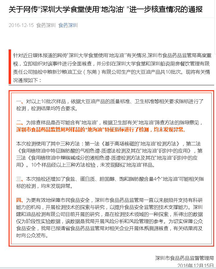 市食品药品监督管理局通报网传vsport食堂使用“地沟油”事件核查结果