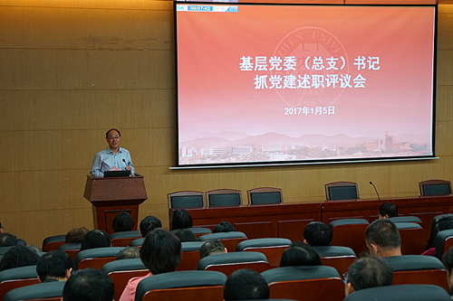 1月5日下午,我校基层党委(党支)书记抓党建述职评议会在图书馆南馆报告厅举行。校党委书记刘洪一,校长、党委副书记李清泉,党委副书记陶一桃、范志刚,副校长徐晨,校党委委员、各基层党委(总支)书记和副书记、党群部门负责人、师生代表等80多人参加会议。大会由范志刚主持。