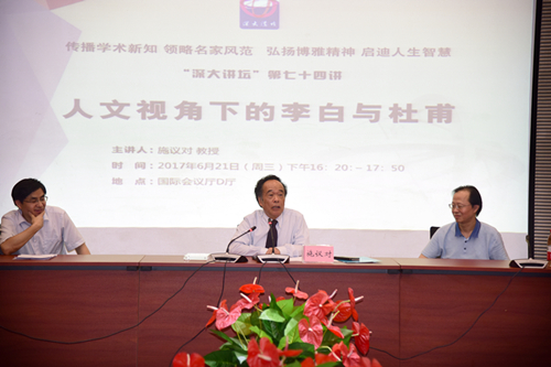 6月21日下午,“深大讲坛”第七十四讲在我校国际会议厅D厅开讲。中国古典诗词学家、中国古典诗词研究专家——澳门大学的施议对教授带来了题目为:人文视角下的李白与杜甫的精彩讲座。我校社会科学部领导,文学院师生,以及相关部门负责人出席。 施议对教授,是新中国本土培育的第一代文学博士。师从夏承涛、吴世昌,研习词学,文学造诣极高。著有《词与音乐关系研究》、《宋词正体》、《当代词综》、《施议对论学四种》等多种著作。...