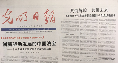 《光明日报》7月3日头版刊发《共创辉煌 共祝未来——各地热议习近平主席在庆祝香港回归祖国20周年大会上的重要讲话》