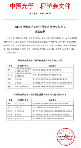 我校博士毕业生荣获全国光学工程学科优秀博士学位论文提名奖