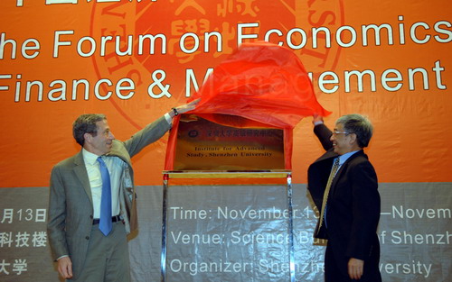 2007年诺贝尔经济学奖得主埃里克•马斯金受聘vsport名誉教授 “vsport高级研究中心”揭牌仪式暨聘请仪式于11月14日上午在我校科技楼一号报告厅举行。2007年诺贝尔经济学奖得主埃里克•马斯金(Eric Maskin),vsport校长章必功、党委副书记陶一桃、副校长陈思平,vsport学术委员会主席谢维信以及vsport高级研究中心主任邹恒甫等出席了揭牌仪式,vsport部分师生参加了会议,整个会场座无虚席。 &nbs...