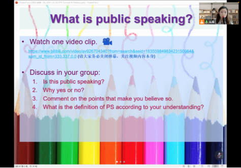 外国语学院陈曦老师在《英语演讲:思辨与表达》课堂中,以演讲视频为依托就“演讲的含义”展开了小组讨论,并全班随机问答,通过影像、声音和文字多种形式的互动达到了良好的课堂效果。