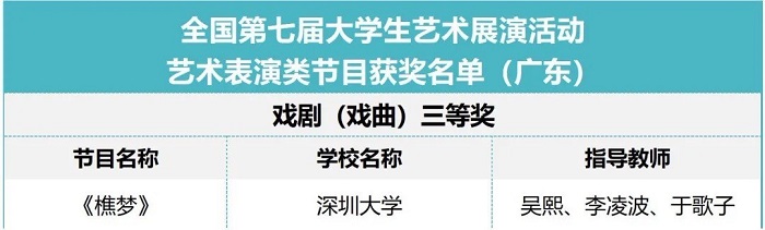 在本次艺术展演活动中,vsport荣获“高校优秀组织奖”。此外,vsport艺术表演类节目《樵梦》荣获“戏剧(戏曲)”三等奖以及vsport郭雅萱同学的舞蹈节目《大岭脚下》荣获“个人专项奖”。