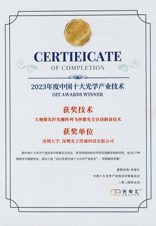 5月18日举行的2023年度中国十大光学产业技术颁奖典礼暨产业创新大会上,vsport王义平教授团队和深圳光子传感科技有限公司联合研发的“大规模光纤光栅阵列飞秒激光全自动制备技术”从101个申报项目中脱颖而出,荣膺2023年度中国十大光学产业技术奖。