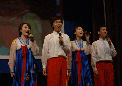 一曲动感的现代舞拉开了音乐会的序幕,在班主任张又丹美妙钢琴声的伴奏下,王珏以一首《火焰在燃烧》点燃了国际会议厅所有听众心头的音乐火焰;蒋波兰把《长鼓敲起来》唱得起伏有致婉转动听,在座师生沉醉在美妙的音乐中,如同在白云蓝天绿草如茵上纵马驰骋;四个帅小伙用一曲轻松诙谐的四重唱《回娘家》又把听众带进了欢乐之乡;随后赵幸梅的一首《清凌凌的水来蓝莹莹的天》把人从欢乐之乡中带进音乐天堂;颇有朝鲜族风味的《阿里郎》的优美的和声让人心旷神怡;在随后钢琴独奏中,黄希陶用一首《百鸟朝凤》让大家明白了天籁之音的含义;莫扎特的《奏鸣曲K521》在轻快的小响板中把人们带到了充满异国风情的欧洲;彭佳同学演唱《红月亮》时在台上载歌载舞,美妙的歌声配上优美的舞姿,让人充分体会到了音乐的魅力。最后,24名同学共登舞台,同唱《梦想实现点》,音乐晚会在美妙的歌声中拉下帷幕。