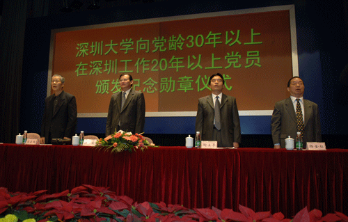 向党龄30年以上、在深工作20年以上的党员颁发纪念勋章,是我市贯彻落实党的十七大精神,尊重党员主体地位、健全党内激励机制、增强党的凝聚力的一项具体举措。在10日的仪式上,校党委副书记、纪委书记陶士平宣读了市委文件《中共深圳市委关于向党龄30年以上在深工作20年上党员颁发纪念勋章的决定》。