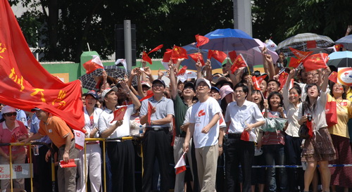 几个化学与化工学院的大学生表示被现场的热烈气氛所震撼。尽管天气很热,但她们心中充满骄傲和喜悦。她们都感到异常激动,表示一定要坚持到底,为中国和奥运加油。