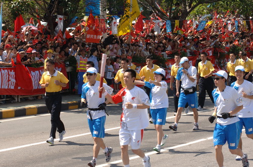 5月8日上午9点17分,2008年北京奥运圣火成功登顶珠穆朗玛峰,中午12点,圣火在深圳市民中心广场点燃。我校校长章必功、高尔夫学院院长张晓春以及学生侯涛作为第76、77、69棒火炬手传递了圣火。