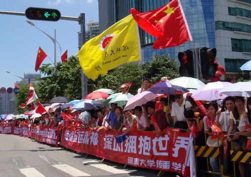 而几个研究生则表示能在这样一个具有重要意义的历史时刻亲自参加活动,感到非常激动,即使天气炎热也要坚守阵地,这是一个难得的机会。高尔夫学院学生谈到,我校学生为迎接奥运圣火做了大量准备工作,如连夜征集标语,制作横幅,为火炬传递加油,为深大加油,为深圳加油,为中国加油!
