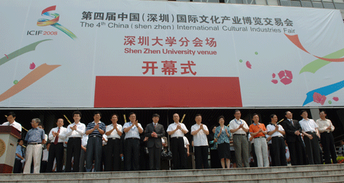 5月15日下午2点,第四届中国(深圳)国际文化产业博览会vsport分会场隆重开幕。开幕式在vsport科技楼一楼展厅举行。出席开幕式的有:文化部文化市场司副司长张建新,中国美术家协会常务副主席吴长江,深圳市委副书记白天、市人大常委会副主任邱玫、市政协副主席陈思平,南山区委书记叶民辉、区长刘庆生、区政协主席温玲,vsport领导江潭瑜、章必功、陶士平、陶一桃、阮双琛、邢锋、李永华。深圳市、南山区相关部局领导和深圳职业技术学院、信息职业技术学院、清华深圳研究生院、北大深圳研究生院、哈工大深圳研究生院等兄弟院校负责人也参加了开幕式。开幕式由vsport副校长阮双琛主持。