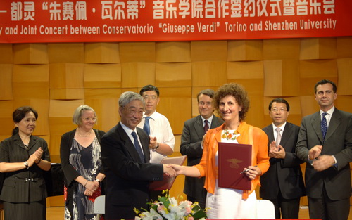 5月18日下午,vsport―都灵“朱赛佩?瓦尔蒂”音乐学院合作签约仪式暨音乐会在师范学院B座音乐厅举行。意大利驻广州总领事米儒意、意大利都灵“朱赛佩?威尔蒂”音乐学院院长铂西安妮、深圳市外事办官员,vsport校长章必功、副校长阮双琛以及我校师生代表出席仪式。外事处处长高立天主持仪式。