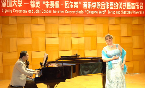 铂西安妮院长致辞。她代表都灵“朱赛佩?瓦尔蒂”音乐学院对深大师生表示感谢和问候。她说,今天的签约仪式暨音乐会象征着友谊与合作,两校的合作从今天开始。都灵“朱赛佩?瓦尔蒂”音乐学院一直以来把扩大对外交流合作作为很重要的工作来做。出于对音乐的热爱,我们希望进一步深入与深大的联系。她祝愿两校合作长久,并邀请章必功校长率团访问音乐学院。