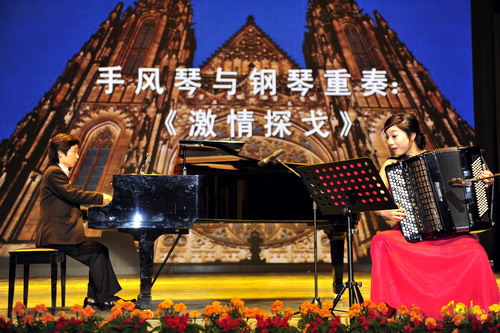 师范学院最年轻教授、被誉为“中国李斯特”的钢琴演奏家――沈文裕也为晚会带来了一首钢琴独奏《匈牙利狂想曲六号》。他还与留德手风琴博士、年轻手风琴演奏家王璐璐合作表演了一首手风琴与钢琴重奏《挪威探戈》。师范学院艺术系解楠、黄戈教授也同台献技,献上了他们精彩的表演。