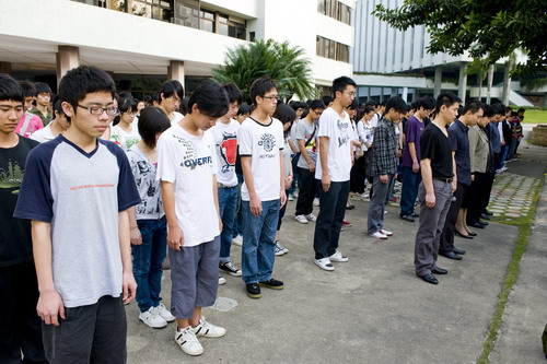 4月21日上午,我校在办公楼广场前举行降半旗默哀仪式,沉痛悼念在青海玉树地震中遇难的同胞。校党委副书记陶一桃、副校长李永华和来自全校各学院的数百名同学参加了悼念仪式。