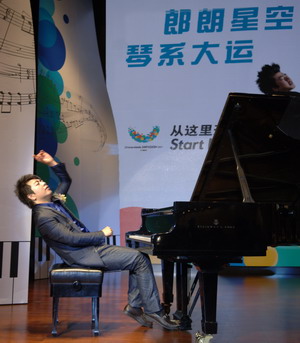 郎朗献奏一曲肖邦的《英雄》,借此曲祝愿本次大运会能成为“史上最牛的大运会”,他激情四射的表演把会场气氛推至高潮。郎朗演奏后,艺术系钢琴专业2006级学生范婧雯代表我校学生上台演奏一曲《热情的快板》,并得到郎朗的细心指导。当媒体问到郎朗是否会在2011年世界大运会开闭幕式上演奏时,郎朗回应说:“我不会让大家失望的,肯定比之前的演奏还要好。”