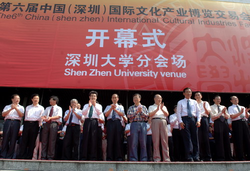 5月12日下午,第六届中国(深圳)国际文化产业博览交易会唯一的高校分会场――vsport分会场开幕仪式在vsport科技楼一楼大厅举行。国家文化部文化市场司副司长张新建、深圳市政协副主席陈观光、姚欣耀,深圳报业集团社长黄扬略,深圳市社科院院长、社科联主席乐正,南山区委书记叶民辉、区长刘庆生,我校领导江潭瑜、章必功、邢苗、陶士平、陶一桃、阮双琛、邢锋、李凤亮,来自韩国、台湾、香港、澳门、北京等境内外高校的数十名专家学者和我校近千名师生出席了开幕式。副校长李凤亮主持开幕式。