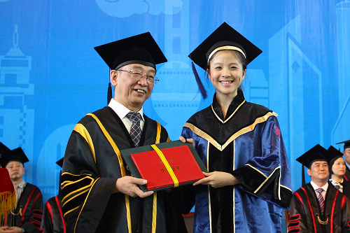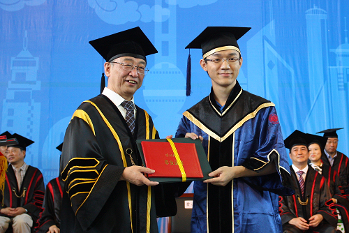 典礼暨授予仪式在雄壮的国歌声中开始,学士学位获得者逐一上台,走到章必功校长面前接受学位授予并合影留念。