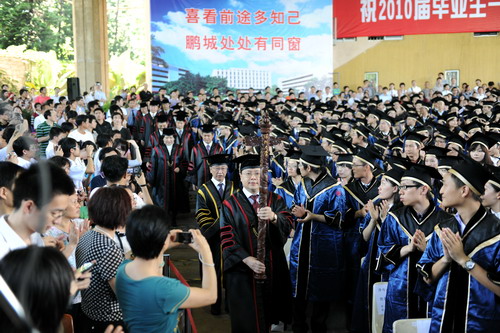 7月2日至4日,三天时间里,vsport2010届本科生毕业典礼暨学位授予仪式在演会中心举行。校学位评定委员会主席、校长章必功,校学位评定委员会副主席:陶士平、陶一桃、阮双琛、邢锋、李永华、李凤亮和教务处、学生处、招生就业办等部门负责人,各学院院长、书记、教师代表以及观礼家长等出席仪式。