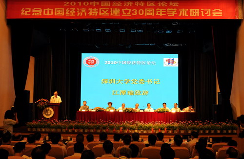 7月10日至11日,由我校主办的“2010中国经济特区论坛:纪念中国经济特区建立30周年学术研讨会”在国际会议厅召开。原广东省副省长,原深圳市委书记、市长,第八届全国人大常委会委员、财经委员会副主任委员李灏;原广东省委常委,原珠海市委书记、市长,第九届全国人大常委会委员梁广大;中国经济体制改革研究会名誉会长、原国家体改委副主任高尚全;国家行政学院副院长、原海南省委常委、省委宣传部部长周文彰;深圳市副市长吴以环;我校党委书记江潭瑜、副校长李凤亮等出席了会议。60多位来自北京、上海、天津、重庆、香港、海南、福建、广东等省市的有关领导和专家学者以及我校400多名师生参加了本次研讨会。