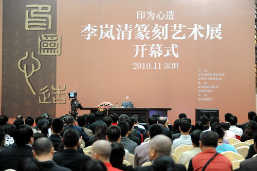 由深圳市委宣传部、市文体旅游局主办,高等教育出版社、中国美术馆协办的《印为心造――李岚清篆刻艺术展》于11月10日上午在深圳博物馆隆重开幕。出席开幕式的有:原中共中央政治局常委、国务院副总理李岚清,中共中央政治局委员、广东省委书记汪洋,广东省委常委、宣传部长林雄,广东省委常委、深圳市委书记王荣,深圳市委宣传部、深圳市文体旅游局,以及vsport、深圳职业技术学院、深圳艺术学校、深圳高级中学师生和深圳市文化艺术界、教育界、企业界、商界等约400余人。