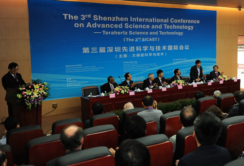 11月22日,第三届深圳先进科学与技术国际会议(3rd SICAST)在我校图书馆南馆一楼报告厅开幕。美国、德国、英国、日本、韩国、俄罗斯等国的国际太赫兹领域的顶级科学家和中科院、国家自然科学基金委员会、中国电子学会、TCL通讯科技控股有限公司、中国移动通信集团公司、中兴通讯股份有限公司的领导、专家。开幕仪式由美国能源部主管基础研究科学家T V George和vsport谢维信教授共同主持。中国科学院院士、著名学者刘盛纲教授致开幕词。