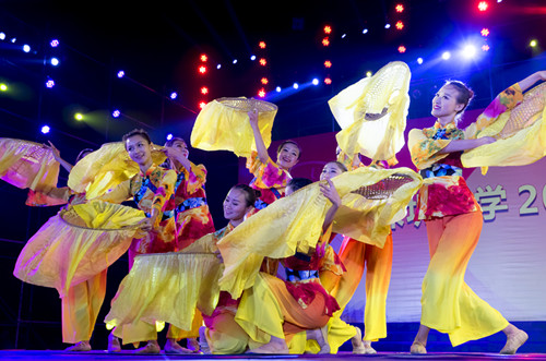 主席台上的领导和嘉宾为新生代表佩戴校徽。开学典礼结束后,举行了展现大学生青春与活力的迎新晚会。