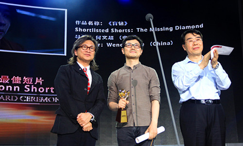 金鹏奖是中国唯一国际级、国际性的新媒体短片奖。本次金鹏奖评选共收到来自104个国家和地区3117部主竞赛单元参赛作品,上传网络票选单元参赛视频数量达24210个。颁奖晚会在深圳广电集团娱乐频道、DV频道、地铁、公交移动电视频道和优酷网、土豆网、搜狐视频、乐视网、爱奇艺等新媒体平台进行全球直播。晚会揭晓了金鹏最佳短片、最佳剧情短片、最佳纪实短片、最佳导演等九个奖项。青年导演何文超执导、演员张译和梁静零片酬出演的微电影《盲钻》获最佳短片奖,同时该片也获得最佳剧情短片奖。
