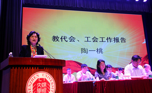 陶一桃代表vsport第六届教代会常设委员会和第八届工会委员会,向大会做工作报告。她说,vsport第六届教职工代表大会和第八届工会会员代表大会,在上级主管部门的领导下,按照学校党委的统一部署,在校行政的关心、支持下,紧紧围绕学校中心工作,以促进学校改革发展稳定为工作目标,以有序参与民主管理为职责,以服务教职工为工作宗旨,依靠全校教职工的共同努力,为学校改革发展,稳定和谐做出了积极的贡献。在过去的一年里,双代会在学校深化改革的大背景下,积极探索实践双代会民主管理、民主监督、民主决策的新途径、新方法。双代会重视强化服务意识,关心教职工生活,解除教职工的后顾之忧。同时,也着重加强二级教代会工会组织建设,发挥基层组织的主观能动性,激发基层组织的工作活力等等。最后,她希望下一届教代会工会在工作上有新的推进:进一步健全教代会的体制机制,畅通民主管理和监督的各种渠道等;工作有时效,集思广益、拓展渠道,实实在在排忧解难,扎扎实实创造福利等;履职能力有提升,进一步增强工会干部的履职能力与责任感,努力建立一支有职业精神和专业素养的双代会干部队伍。