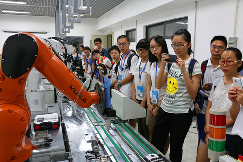 上午,同学们分组参观了机电与控制工程学院实验室和高等研究院实验室。在参观高等实验室时,同学们聆听了学院专业方向的简介及个人研究项目的介绍,参观了金融实验室、中央实验室、显微镜实验室等,还观看了PCR技术的现场演示。在参观机电与控制工程学院实验室的时候,同学们参观了工业机器人、 学生创新活动、电动汽车与轨道交通等实验室,近距离接触了柔性制造系统、交通监控无人机等。另外同学们还在王华权教授及其教学团队的带领下进行了“数字DIY”。 参观过后的同学们感慨,进入实验室就像进入一个处处充满高科技的小型高端工厂,好奇心瞬时爆棚;同时他们还了解到实验设备的工作原理与科研价值,增长了见识,拓宽了视野。