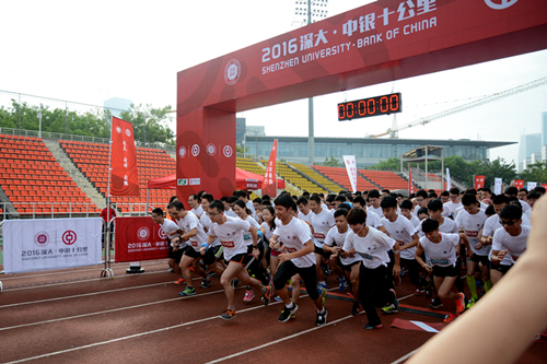 11月13日上午,2016深大•中银10公里长跑活动在元平田径场举行,我校3000多名师生与校友共同参与。南山区副区长肖辉、深圳市银监局副局长胡艳超、深大副校长黎军,及中国银行深圳分行行长宁效云出席了长跑活动。