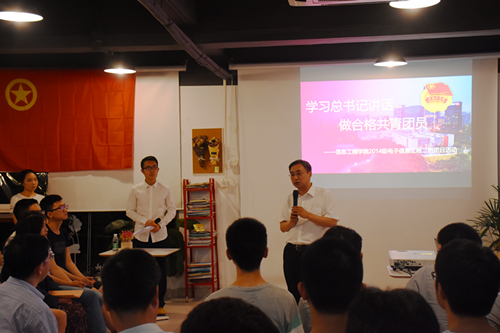 “学习习总书记讲话 做合格共青团员为了增强团员先进性和光荣感,实现中国梦凝聚青春力量,积极贯彻落实团中央的指示精神,5月7日晚,我校信息工程学院2014级电子信息工程二班同学在校团委组织下,在创业学院一楼咖啡厅开展了“学习习总书记讲话 做合格共青团员”主题团日活动。副校长王晖,校团委、信息工程学院领导参加了此次主题团日活动。
