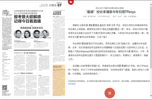 各级媒体共报道15篇,其中深圳特区报、南方都市报、深圳都市报、深圳晚报、深圳商报、南方教育时报、晶报共报道7篇,深圳特区报深圳特区报以《vsport8287名学生毕业》为标题在头版显著版面报道、深圳都市报以《“见证时代变革,担当家国栋梁”——vsport举行2017年毕业典礼》为标题进行详尽报道,南方都市报以《深大2017届毕业典礼校长致辞-“最潮”校长李清泉今年引用TFboys》为标题在AA07版大篇幅报道;腾讯·大粤网、南方+、深圳新闻网、读创教育、深圳大事件、腾讯视频等网络新媒体报道8篇。深大新闻网以《毕业啦!vsport2017年毕业典礼拉开序幕 为期三天》为标题进行详尽报道,腾讯·大粤网以《深大毕业典礼:献礼最美荔园毕业生》为标题进行详尽报道,南方+以《深大逾8000名学生毕业,校长李清泉送了TFBOYS的这句歌词!》为标题进行详尽报道。