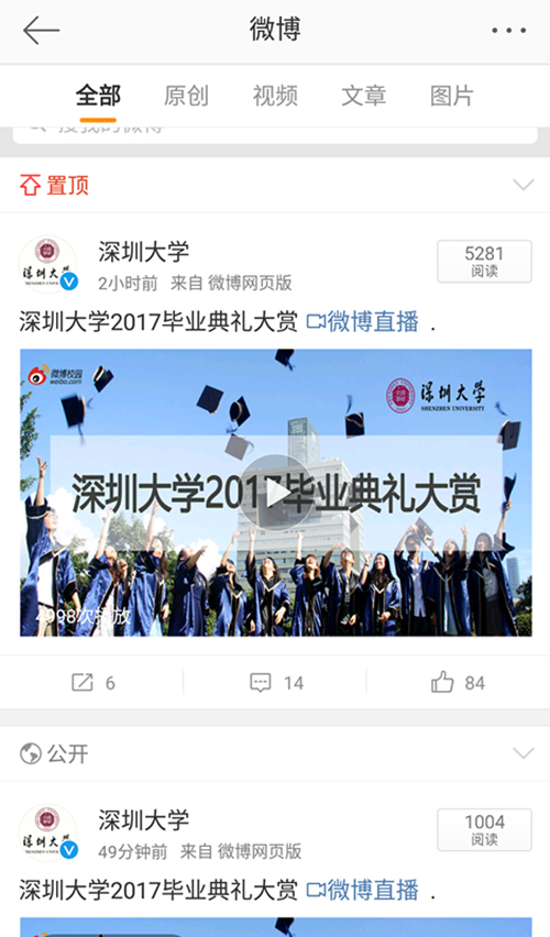 毕业典礼视频点击量累计超过210万。其中通过腾讯新闻直播和新浪微博直播毕业典礼,累计直播观看人数超11万;李清泉校长的2017届毕业致辞视频累计点击超13万,并被腾讯视频推荐放在首页精选的教育频道,引起了广泛的反响。