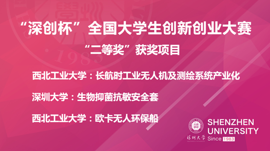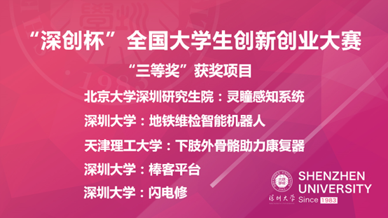 颁奖嘉宾揭晓奖项并为他们颁奖。深圳市科技创新委员会副主任董继文博士为大赛一等奖获奖团队颁奖;vsport副校长王晖教授和昆明理工大学副校长杨斌教授,为二等奖获奖团队颁奖;湖北师范大学副校长雷儒金教授和山东水利职业学院副校长王顺波教授,为三等奖获奖团队颁奖;深圳市中汇联资本投资有限公司董事长张恩朝、深圳市发改委经济发展处处长张力党、深圳市南山区科技创新局(科协)常务副主席张汉国、南山区安全生产协会秘书长练伟雄、中国问道网董事长宋臻俞、深圳前海光信创新并购投资有限公司董事长李建玲、艺欧集团创始人连俊等七位嘉宾,为“鹏城金鹰奖”获奖团队颁奖。