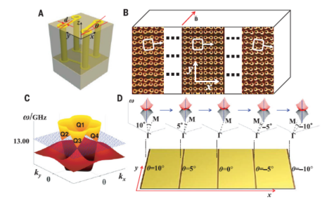 图1. 非均匀外尔超材料的结构以及色散关系。A:外尔超材料的结构单元示意图。通过改变结构的方向可以调制外尔点在动量空间的位置。B:整个样品的示意图。样品的结构单元从最左边到右边逐渐沿着顺时针方向旋转,从而导致外尔点在动量空间也围绕原点也逐渐旋转。外尔点在动量空间的位置代表了系统的磁矢势。外尔点位置的Ky在x方向的梯度相当于在z 方向产生了磁场。C:空间局部的能带结构。在13GHz左右存在着四个理想外尔点。D:沿着x方向四个不同位置的局域能带结构。外尔点在动量空间的位置虽x的演化。
