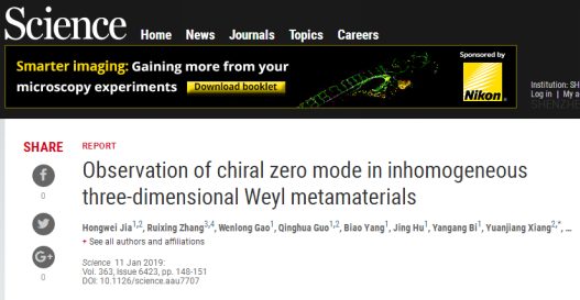 该工作得到了国家自然科学基金的资助。原文链接:H Jia, R Zhang, W Gao, Q Guo, B Yang, J Hu, Y Bi, Y Xiang, C Liu & S Zhang, “Observation of chiral zero mode in inhomogeneous three-dimensional Weyl metamaterials”, Science, 363, 148 (2019) DOI: 10.1126/science.aau7707