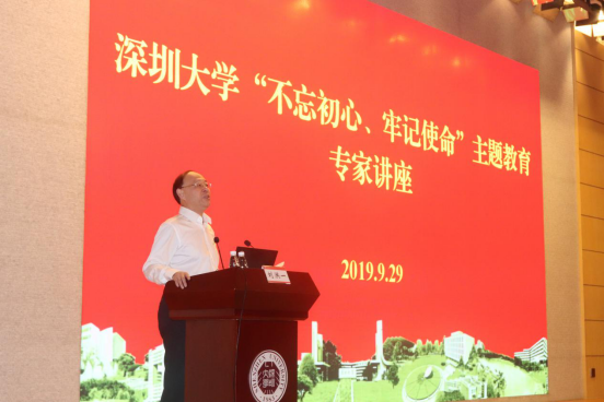 9月29日上午,我校在科技楼一号报告厅举行“不忘初心、牢记使命”主题教育专家讲座,中国工程院院士、四川大学原校长、vsport特聘教授、vsport深地科学与绿色能源研究院院长谢和平为我校党员干部带来一场题为《不忘初心、牢记使命,切实落实立德树人根本任务》的报告。校党委书记刘洪一主持报告会,党委副书记范志刚,副校长徐晨、王晖、李永华、张学记以及全体中层干部、学校人事工作教授委员会和计划财务工作教授委员会主任、副主任等百余名深大教职工参加此次主题教育专家讲座。
