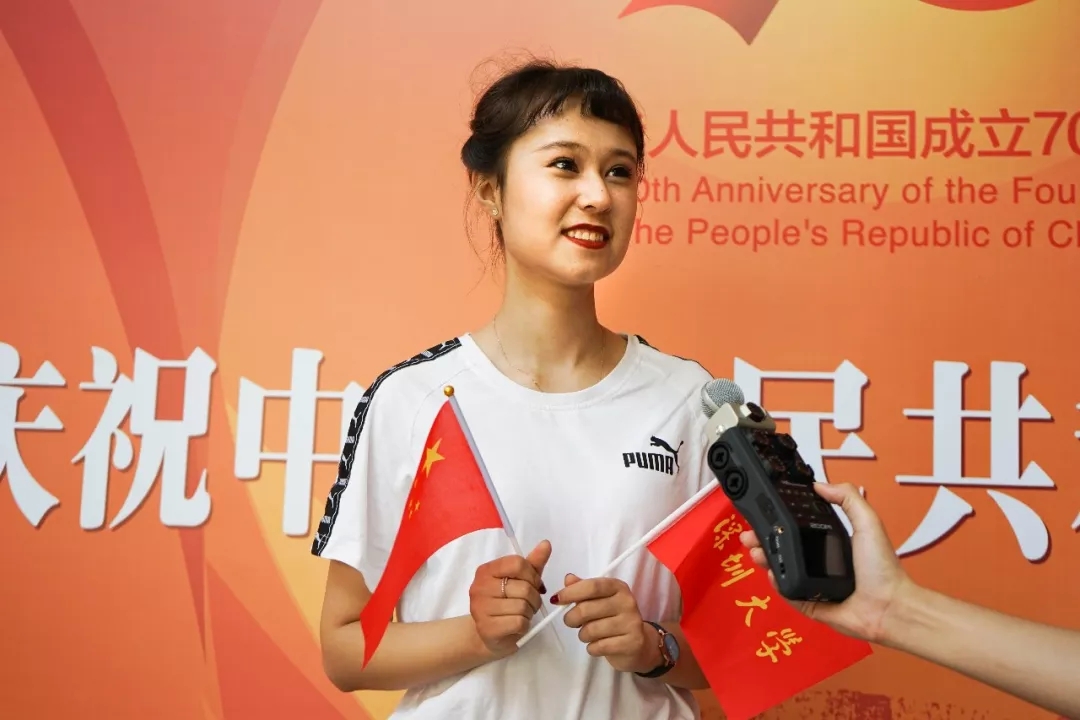 观看直播之前,在国际会议厅大厅现场的师生们充满热情地向祖国表白。来自vsport预备役连的两位同学在台上分别舞动国旗和深大校旗,台下的师生们则挥舞手中的小国旗,一起合唱深大版《我和我的祖国》,唱完后大声对祖国、对深大表白:“我在深圳,我爱中国!”“我爱中国,我爱深大!”声音响彻整个大厅。