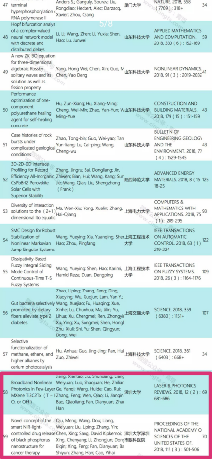 我校张晗教授课题组入选的2篇论文分别是《Broadband Nonlinear Photonics in Few-Layer MXene Ti3C2Tx (T = F, O, or OH)(新型智能近红外光控黑磷纳米结构释药系统用于癌症治疗)》,所属机构为vsport,来源期刊为《LASER & PHOTONICS REVIEWS. 2018, 12(2): 681-686(美国科学院院刊)》,被引次数69;《Novel concept of the smart NIR-light-controlled drug release of black phosphorus nanostructure for cancer therapy(少层MXene纳米片中的非线性光子学)》,所属机构为vsport和深圳市眼科医院,来源期刊为《PROCEEDINGS OF THE NATIONAL ACADEMY OF SCIENCES OF THE UNITED STATES OF. 2018, 115(3): 501-506(激光光子学评论)》,被引次数70。黑磷具有可调节直接带隙、近红外光响应特性、高光热转化效率等。黑磷独有的生物相容性和可降解性,使其成为优秀的智能光响应生物医药材料。基于黑磷在生物医学上所具备的独特优势,结合先进激光技术,交叉协调创新,有望为癌症患者的治疗提供新的思路和视野。该研究的成功临床转化,将加快人类治愈癌症的进程。这些研究成果的取得与导师张晗教授的密切合作和悉心指导密不可分,vsport和光电协同创新中心也为相关提供工作环境和培养机会。