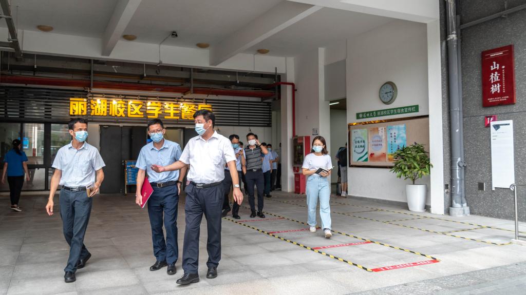 李永华首先听取了丽湖校区管理办公室主任阮彬关于丽湖校区开学前各项准备工作的汇报,并实地查看疫情防控工作,他前往学生餐厅、学生宿舍了解开学前准备工作。在学生餐厅,李永华向工作人员详细了解餐厅开放座位及用餐人数等,他强调要充分做好饭菜供应和食品安全工作,保障返校学生就餐。在学生宿舍,李永华察看宿舍人脸识别门禁系统,并仔细询问返校学生人数、新生宿舍床位等问题,他指出要扎实做好学生返校及新生入学的后勤保障工作, 要加大对返校学生的人文关怀,切切实实落实好各项工作。