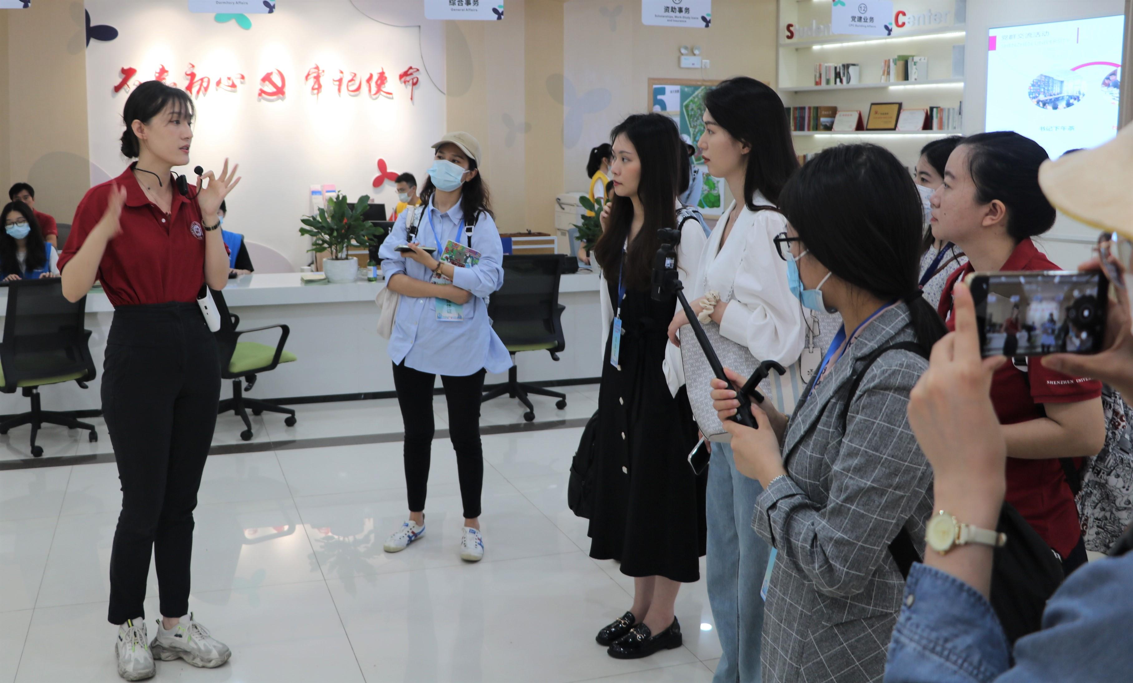 “大家注意到我们前台的工作人员都穿着蓝色或黄色的马甲,他们不是学校老师或工作人员,全部是在校大学生。团队完全由学生自我管理、自我运营。”正值建党100周年,记者们颇为关注高校党群建设,在vsport党群服务中心详细参观,了解其发展历程、团队概况、党建业务等。