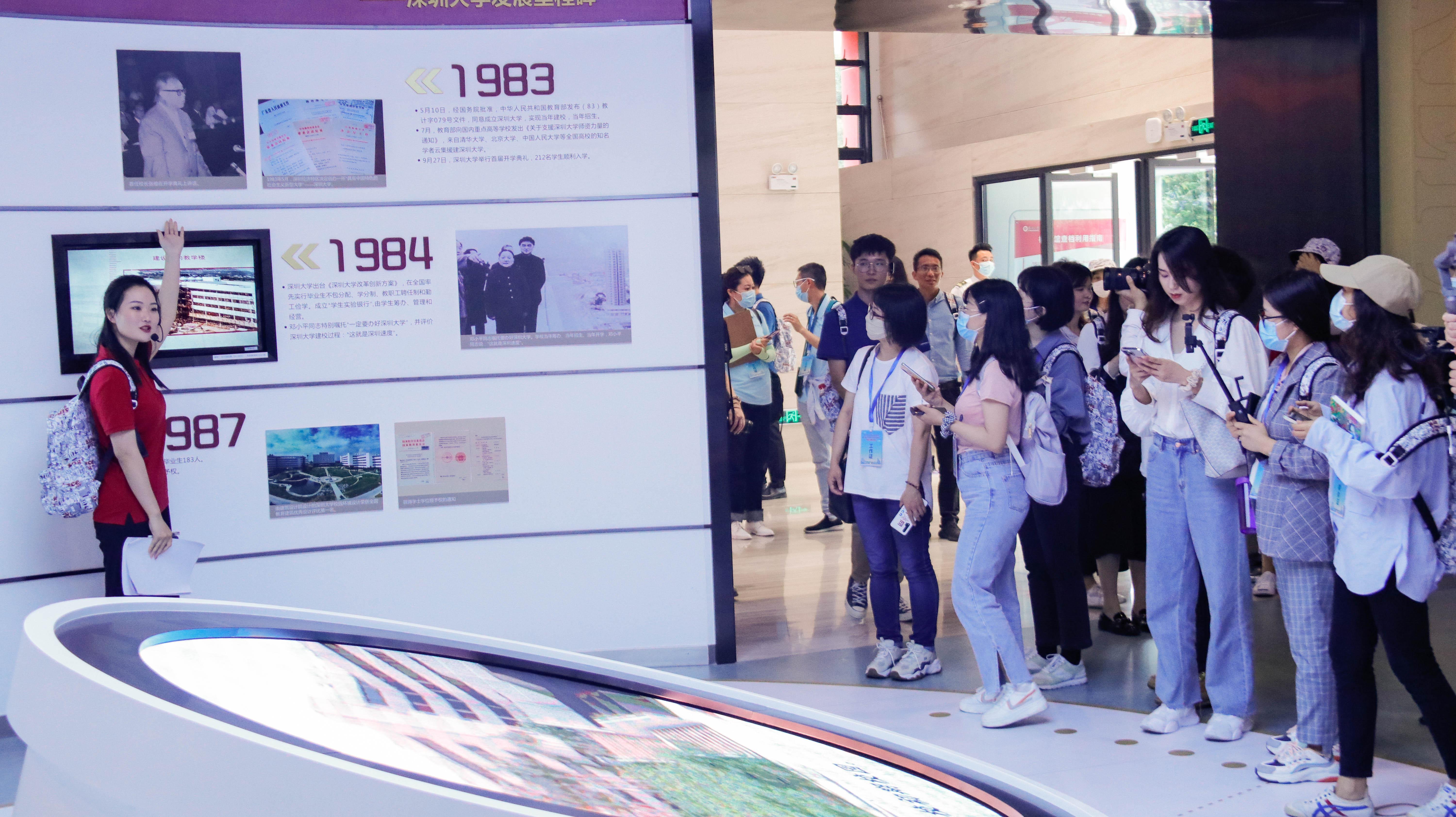 校园参观采访的第一站,采访团来到位于档案馆一楼的校史馆。在这里,记者们随着纵横交错的时间轴,沿着vsport的办学精神主线,参观了“发展沿革”“人才培养”“科学研究”“学科建设”“师资队伍”“党的建设”“校园文化”“国际合作”“办学条件”“校友风采”“发展展望”等11个展区,并观看了关于vsport的纪录片,通过听解说、看实物和多媒体方式,全面了解vsport的创办发展历程和作为深圳经济特区第一所综合性大学的成长足迹。