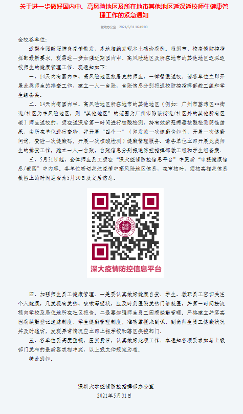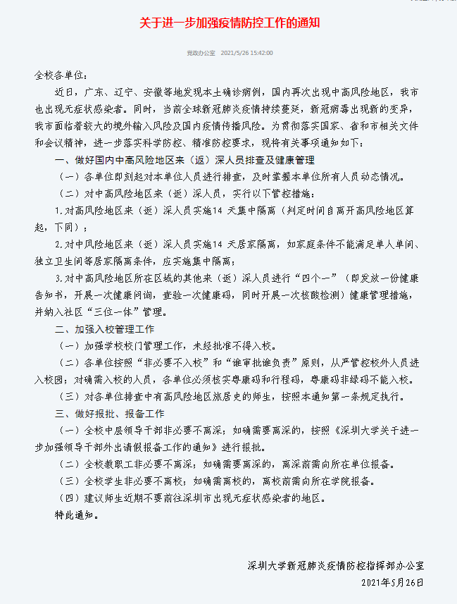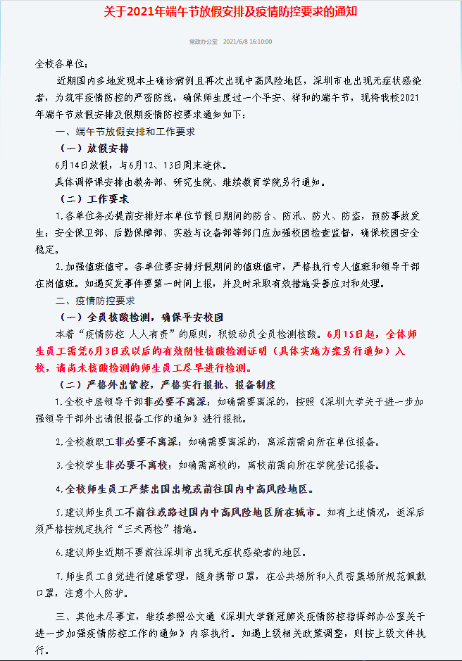 在常态化疫情防控以及近期广东部分地区疫情形势严峻的背景下,学校高度重视端午假期疫情防控工作,并结合广东疫情的最新情况连续发布《关于进一步做好国内中、高风险地区及所在地市其他地区返深返校师生健康管理工作的紧急通知》《关于进一步加强疫情防控工作的通知》《关于2021年端午节放假安排及疫情防控要求的通知》《深大师生核酸检测及入校申报实施方案(2021年6月15日起执行)》,加强部署,并作出“全员核酸检测,确保平安校园”、“严格外出管控,严格实行报批、报备制度”等各项要求,着力防范疫情风险。